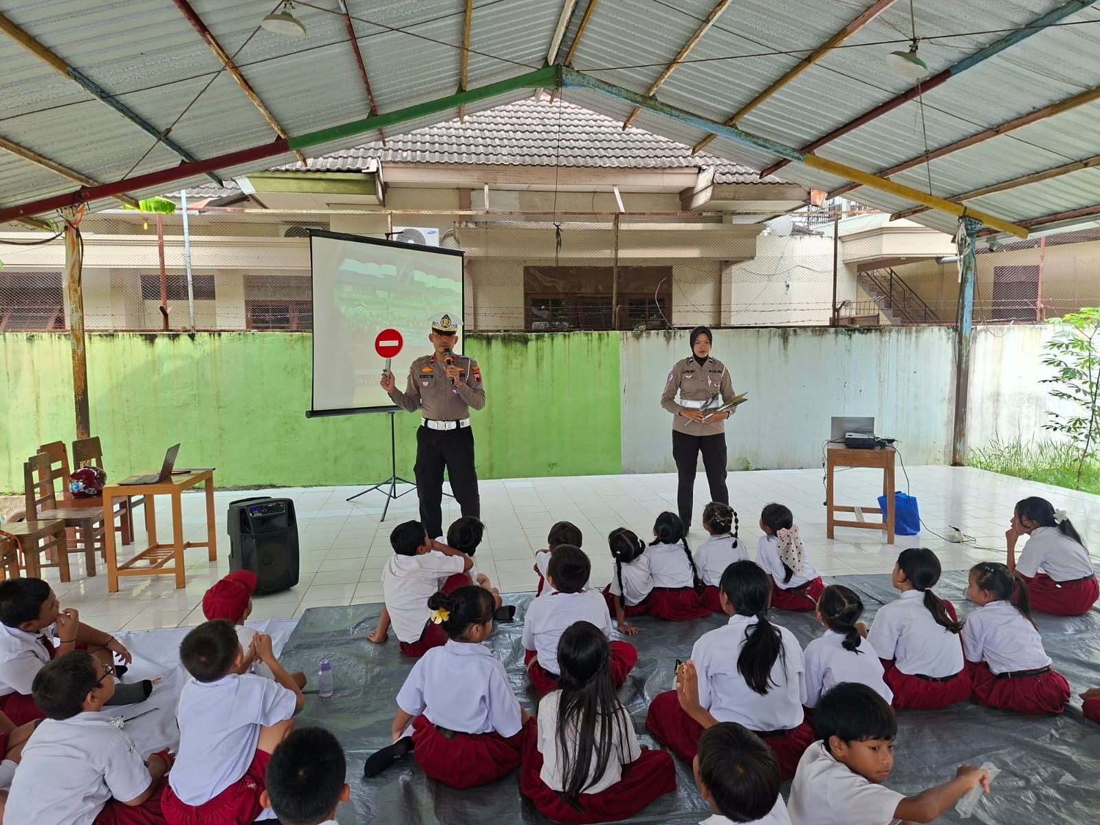 Para siswa SD Sion Krida Dharma tampak antusias mengikuti materi yang dikemas secara interaktif. Petugas Satlantas memastikan pesan tentang pentingnya menaati aturan lalu lintas tersampaikan dengan bahasa yang mudah dipahami anak-anak.