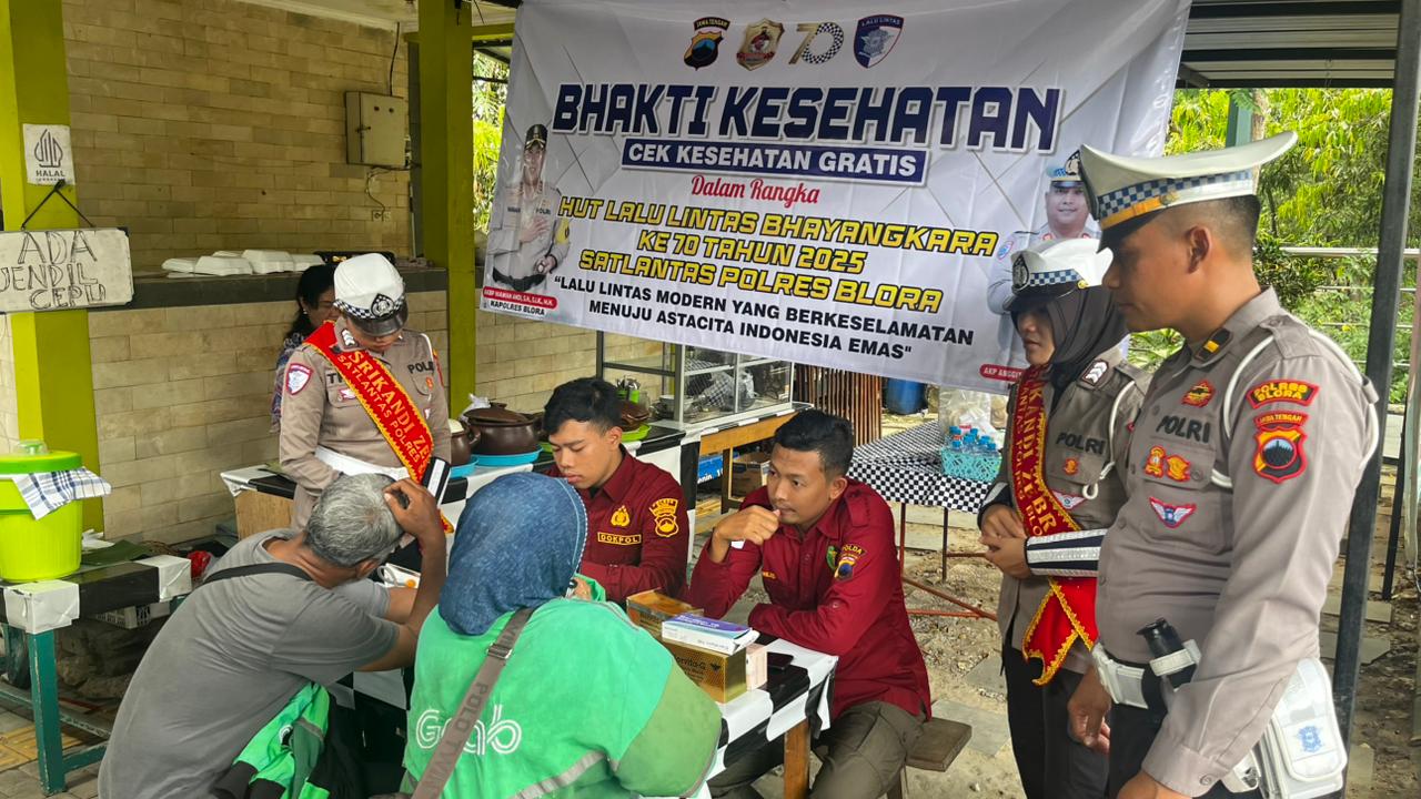 BLORA - Satuan Lalu Lintas (Satlantas) Polres Blora menggelar bakti kesehatan gratis bagi komunitas pengemudi ojek online (ojol) Grab Blora. Kegiatan ini diselenggarakan di Posko Ojek Online Grab Blora pada Rabu, 10 September 2025, dalam rangka memperingati Hari Ulang Tahun (HUT) Lalu Lintas Bhayangkara ke-70.